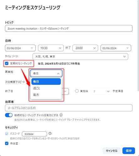 完全に個人的メモです。 以前は、Zoomでの「固定時刻なしでの定期ミーティング」を作る際には、ZoomのWindowsアプリから作成できていたのですが、いつからなのかわかりませんが、2024年3月現時点では、作れなくなっていました。 上記の通り、再実施の欄に「…